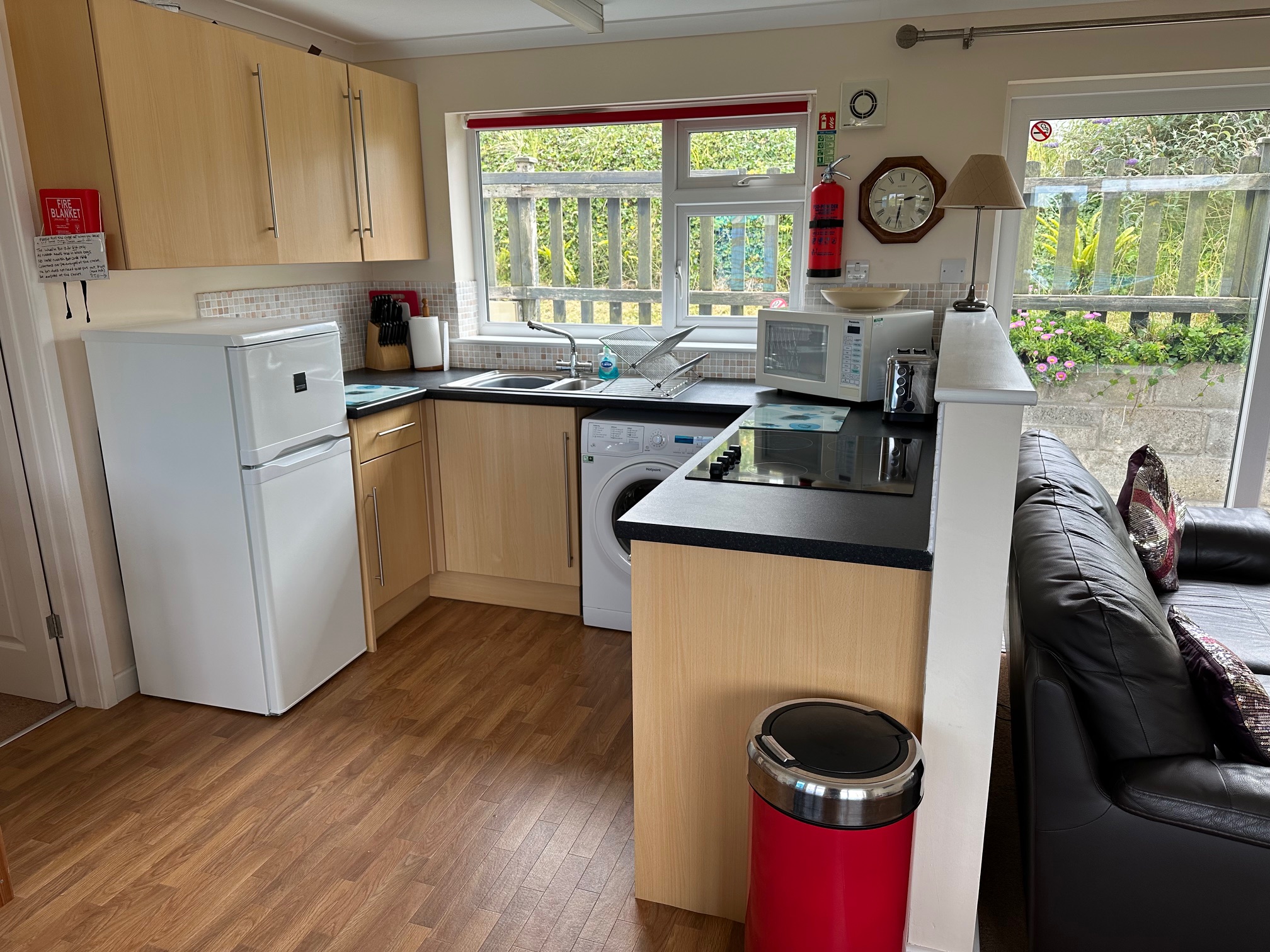 - Kitchen - Fridge freezer, fan assisted oven, 4 ring halogen hob, microwave oven, kettle, toaster, washing machine, stainless steel sink and drainer, worktop area for food preparation.