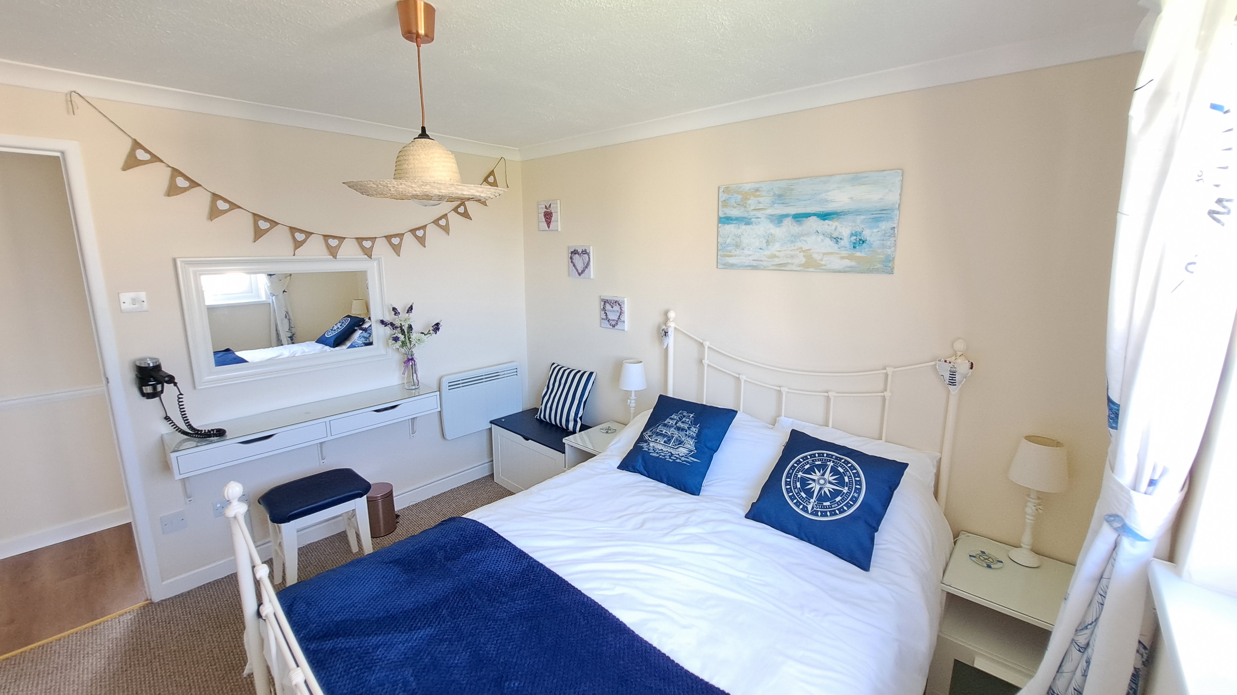 Bedroom 2 Standard double bed, 2 bedside tables with drawers, 2 under bed drawers, wall hooks, wall mounted TV/DVD combo and full-length mirror.