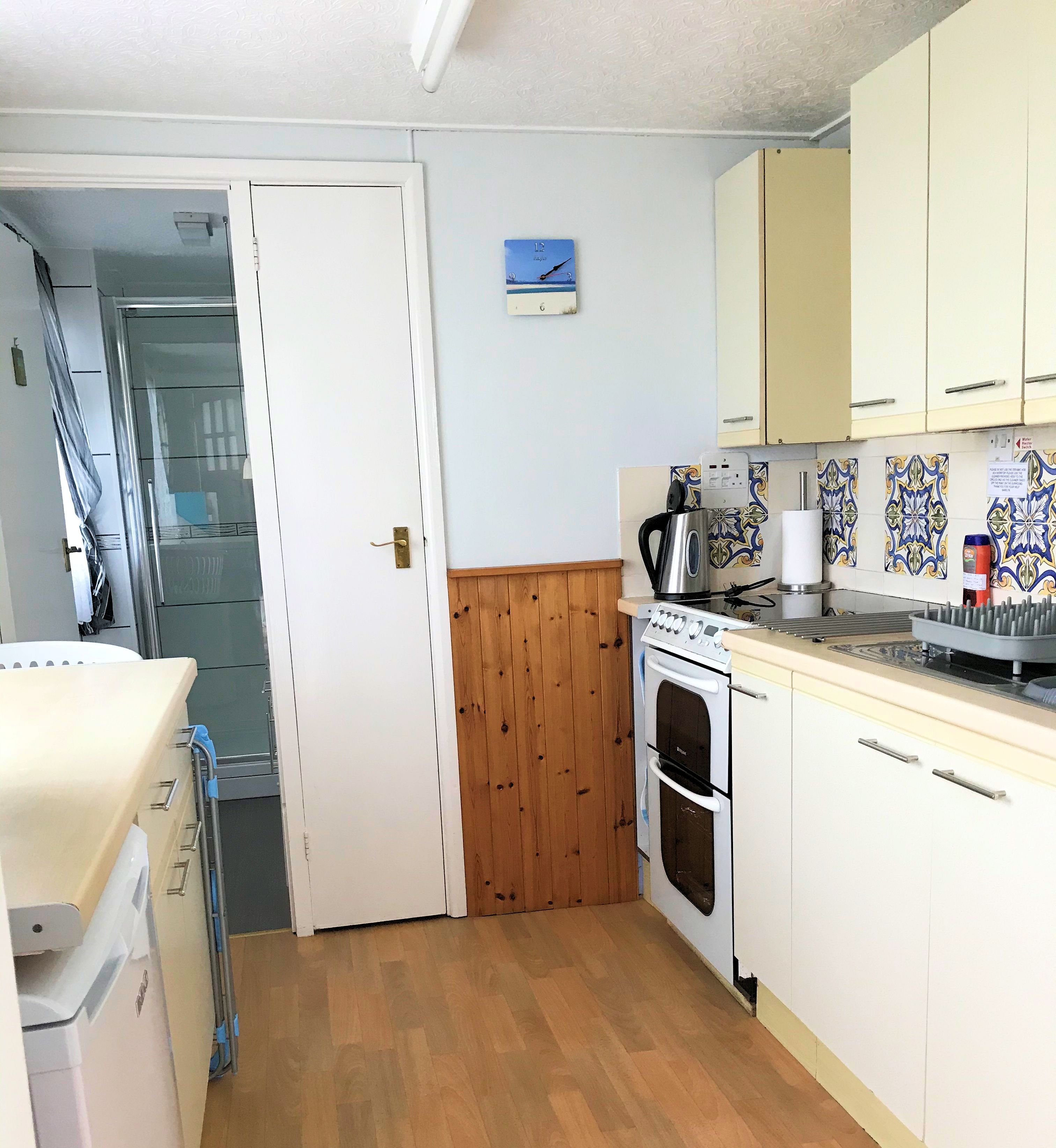 - Kitchen : Full size double oven and grill, ceramic hob, fridge with integrated feezer, microwave, toaster, Iron and ironing board and all the cutlery and utensils required.