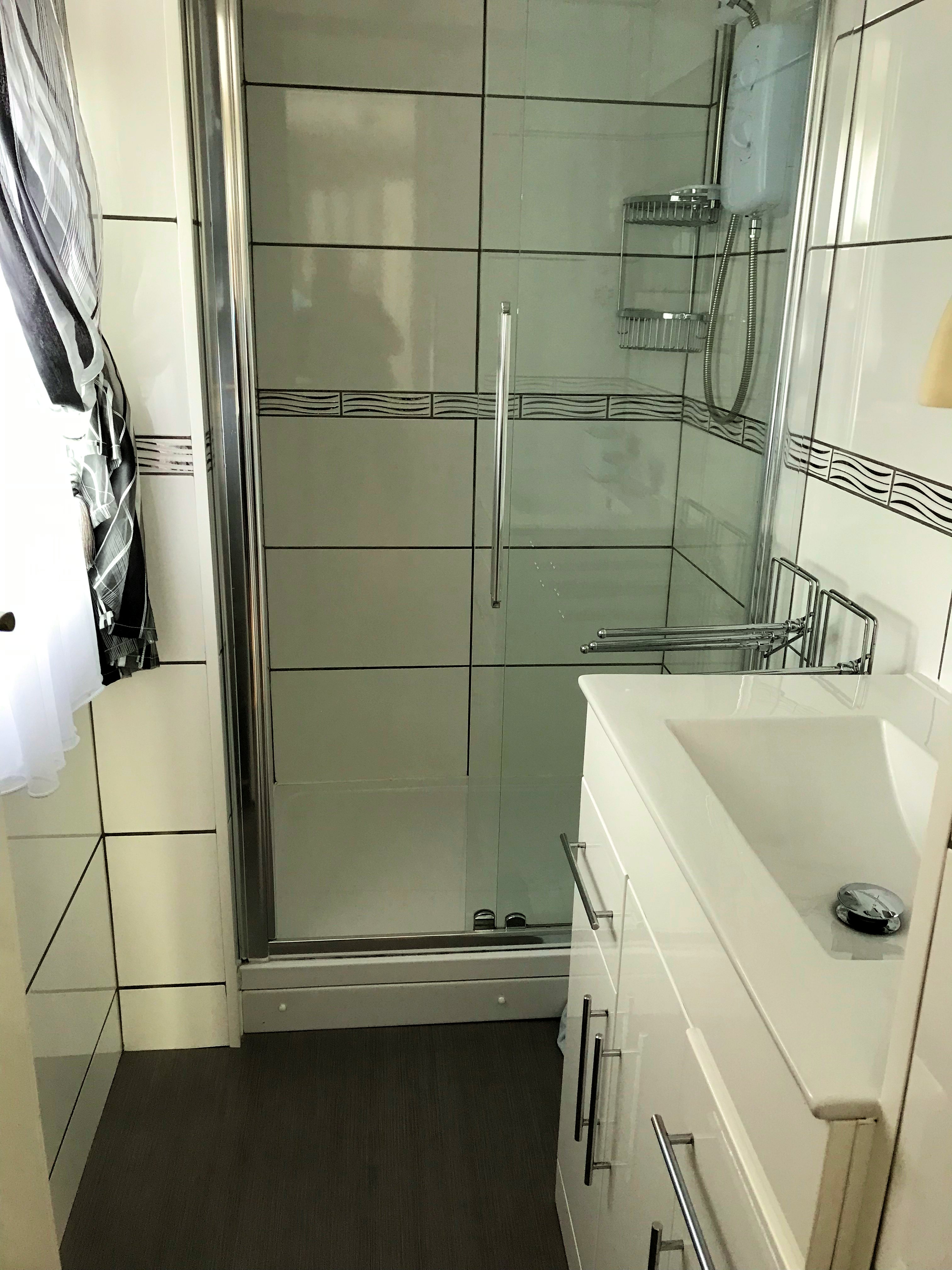 - Shower room : Modern electric shower and basin unit with cupboards and drawers, waterfall tap, wall mounted heater hooks and towel rail.