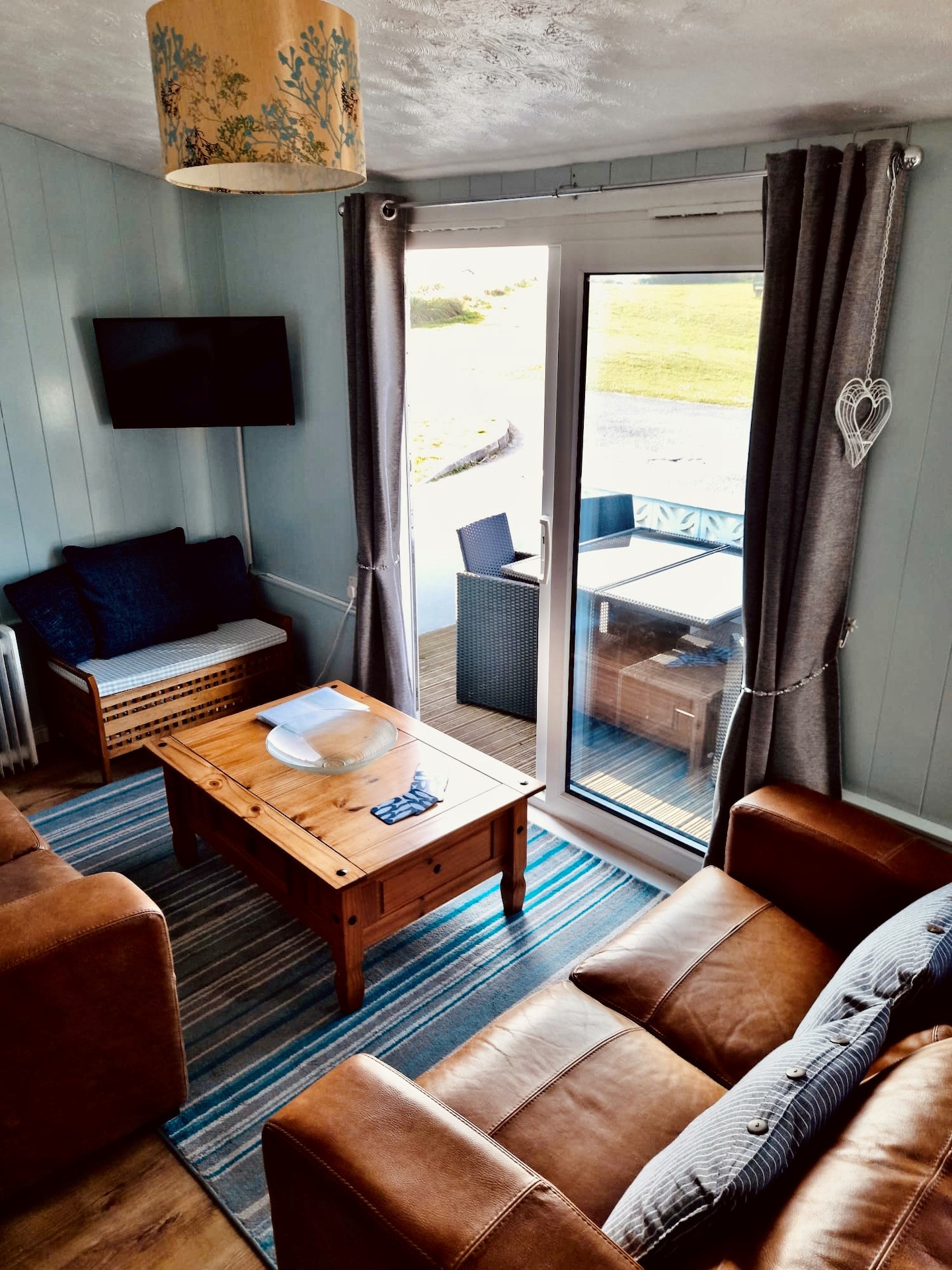 Lounge/ Diner– Twin leather two seater settees, wicker chair, wall mounted heater with TV and sliding patio doors. Four seater dining table.